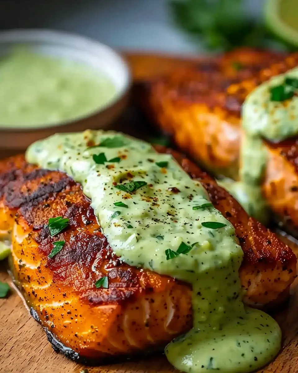 6. Serve the salmon topped with the creamy avocado lime sauce.