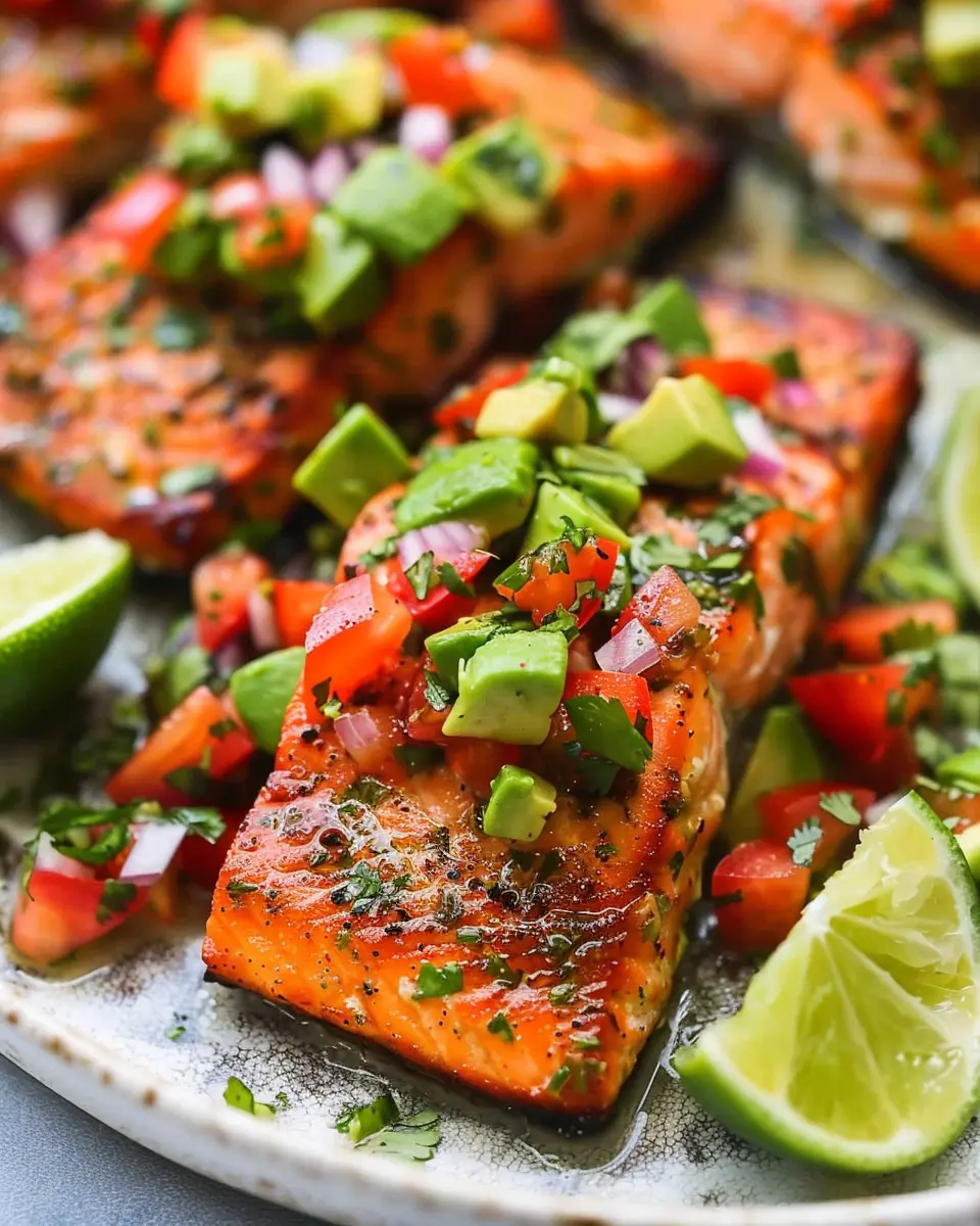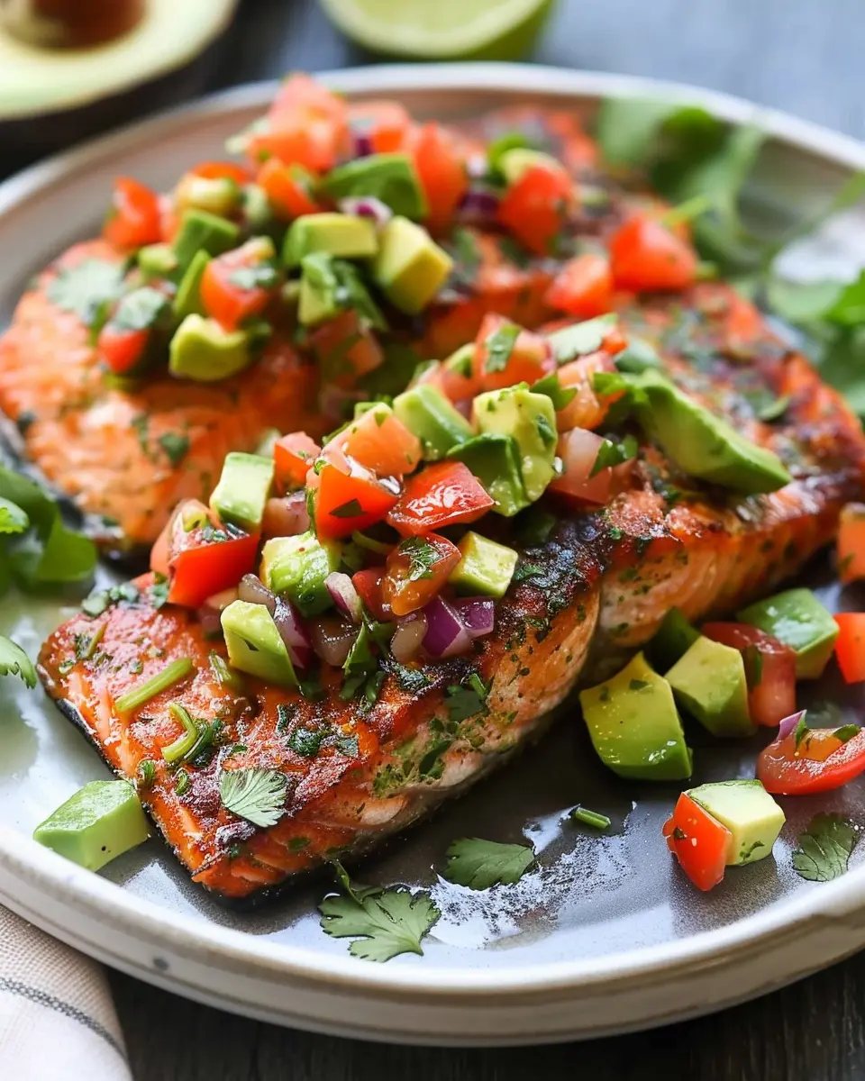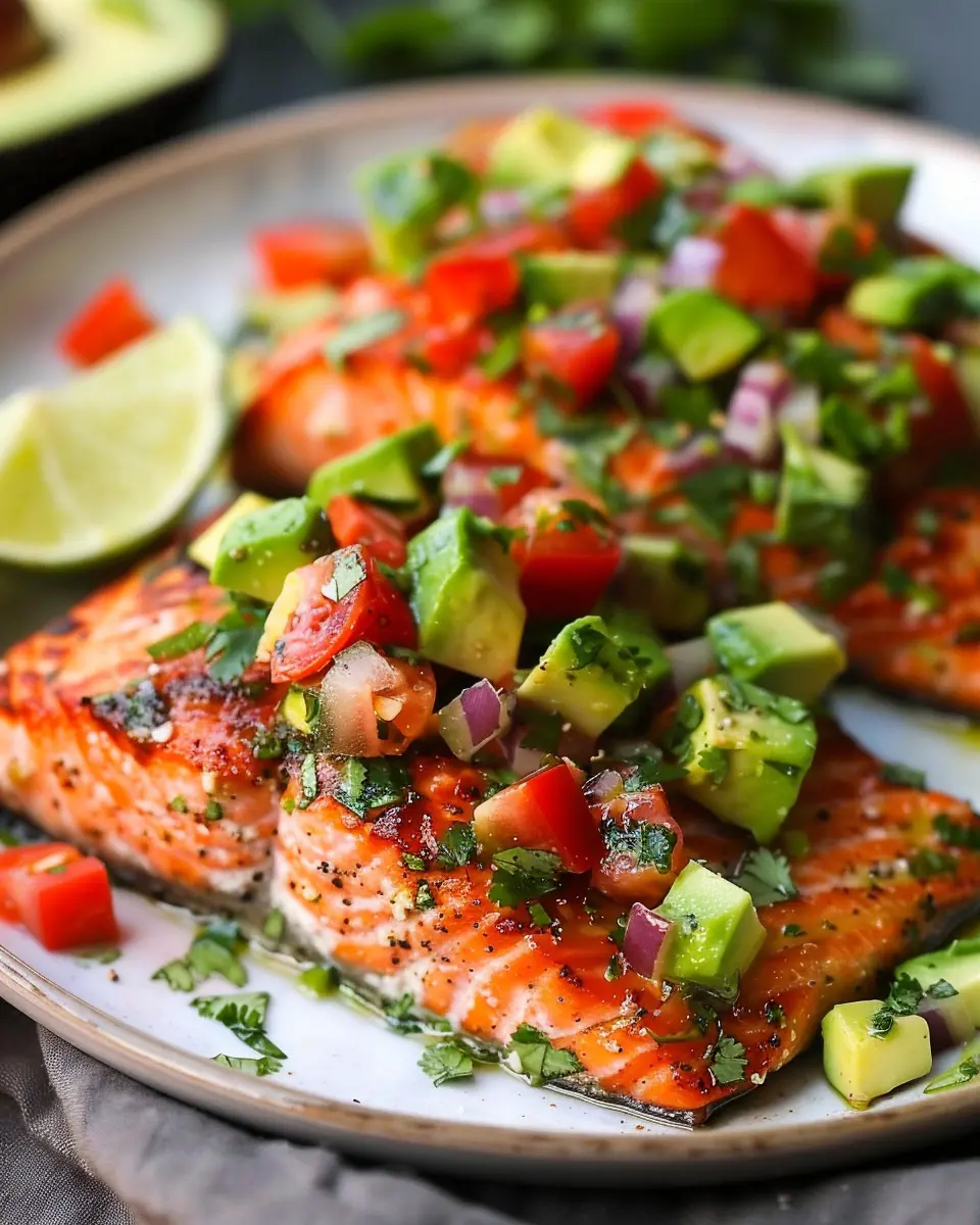 Deliciously baked cilantro lime salmon paired with fresh avocado salsa, perfect for a healthy meal.