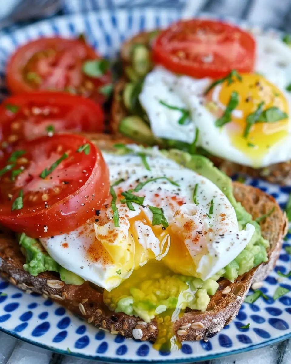 - Place the fried egg on top of the tomato and avocado toast.