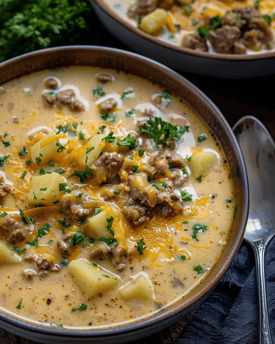 This cheesy beef and potato soup is the ultimate comfort food, perfect for chilly days.