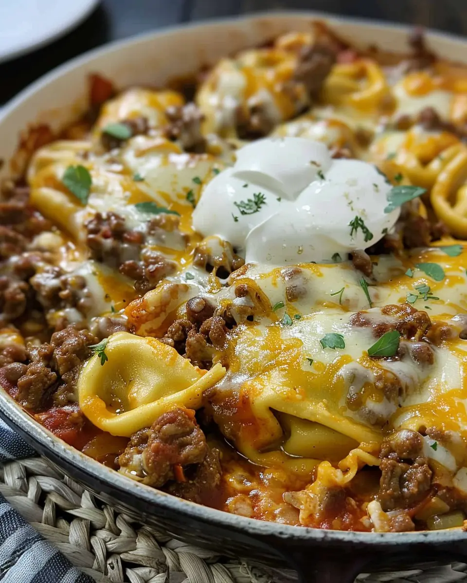 A delicious blend of cheesy beef and tortellini, perfect for comfort food lovers.