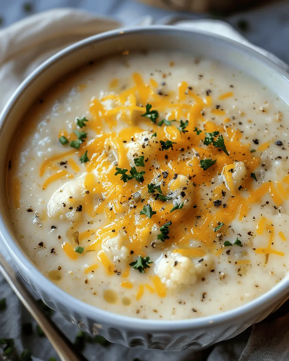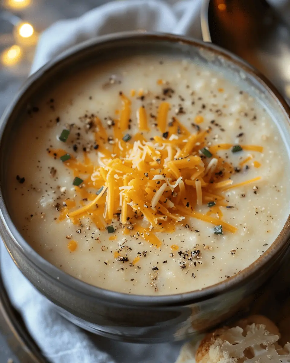 Keywords: Cheesy Cauliflower Soup, Comfort Food, Soup Recipe