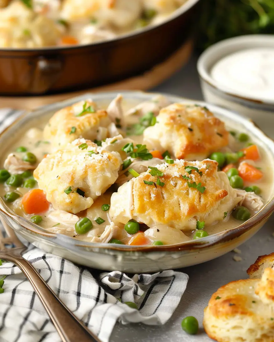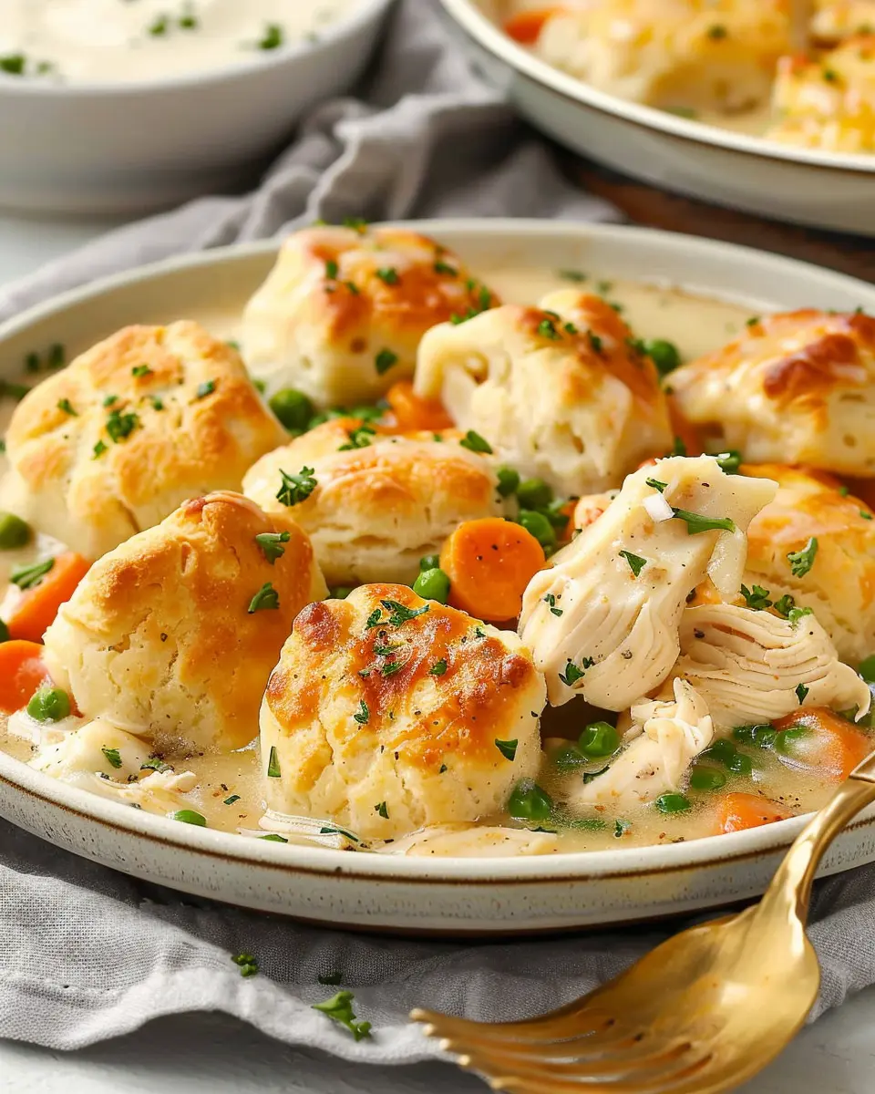 Enjoy a comforting bowl of Chicken & Dumplings with Biscuits. This easy recipe is perfect for any home, bringing warmth and flavor to your dinner table.