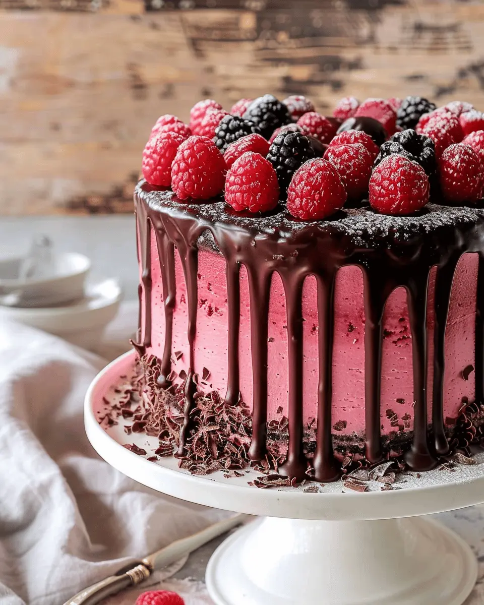 Finally, it’s time to make your chocolate raspberry cake shine! Use the chocolate ganache to drizzle over the cake top, allowing it to drip down the sides for that ‘wow’ factor. Finish off with fresh raspberries on top, perhaps even some mint leaves for a pop of color. Not only will this look stunning, but it will also excite anyone who takes a bite!