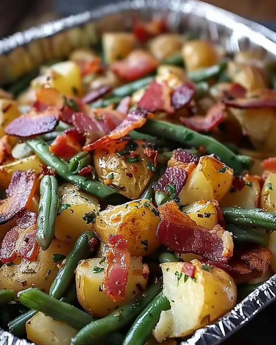 A delicious blend of green beans and potatoes, flavored with turkey bacon and a ranch seasoning.