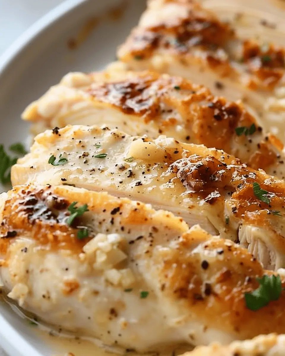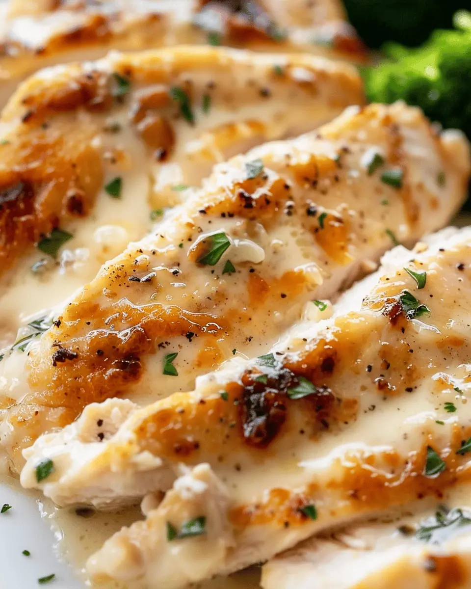 Delight in a rich and creamy garlic parmesan sauce enveloping tender chicken, perfect for an indulgent meal.