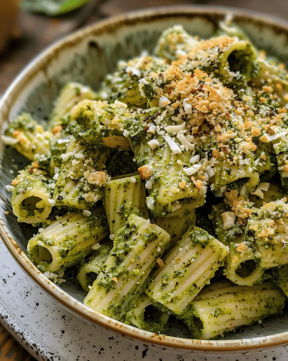 Creamy Pesto Rigatoni: Indulgent Dish with Chili Garlic Breadcrumbs