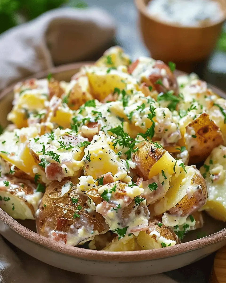 A delicious and hearty potato salad featuring crispy smashed potatoes, turkey bacon, and chicken ham for a savory touch.