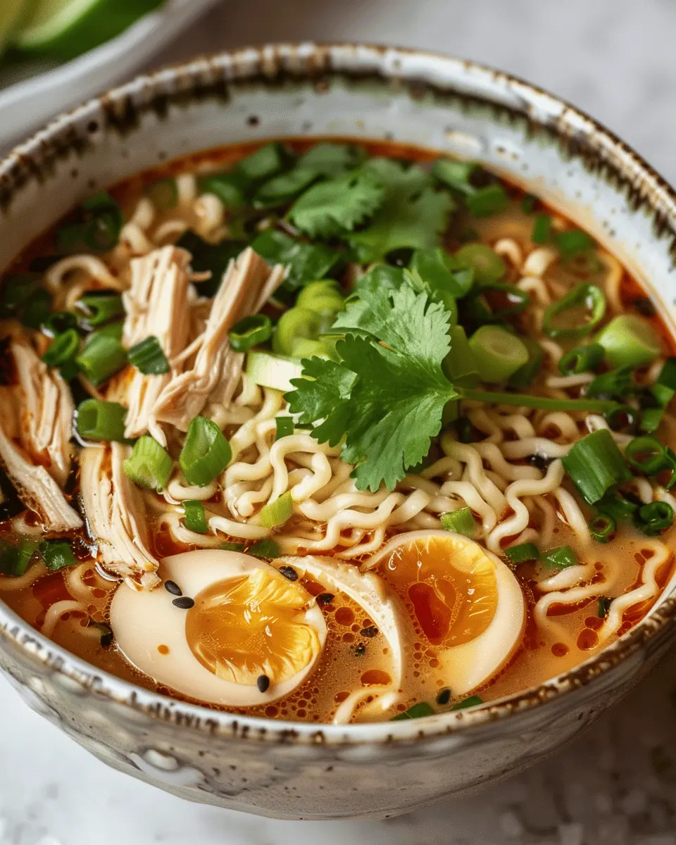 Now it’s time to indulge in your homemade crockpot chicken ramen! Ladle the ramen into bowls and top with any remaining green onions, a halved boiled egg, and a sprinkle of sesame seeds if you have them on hand.