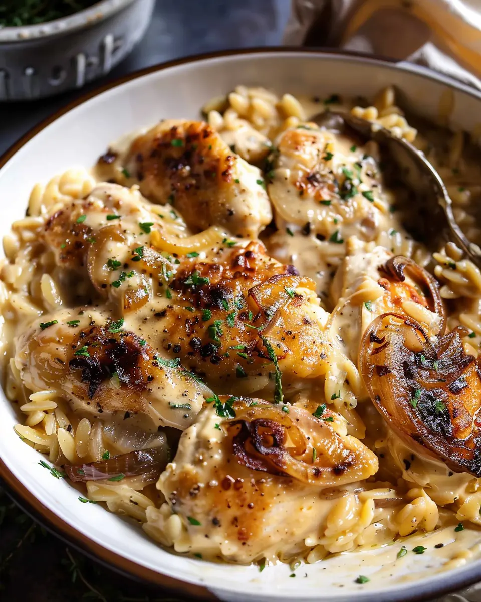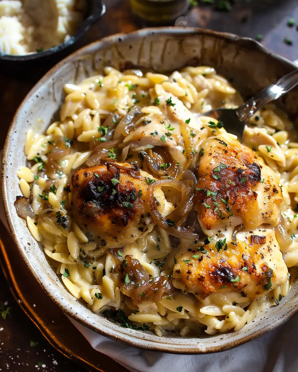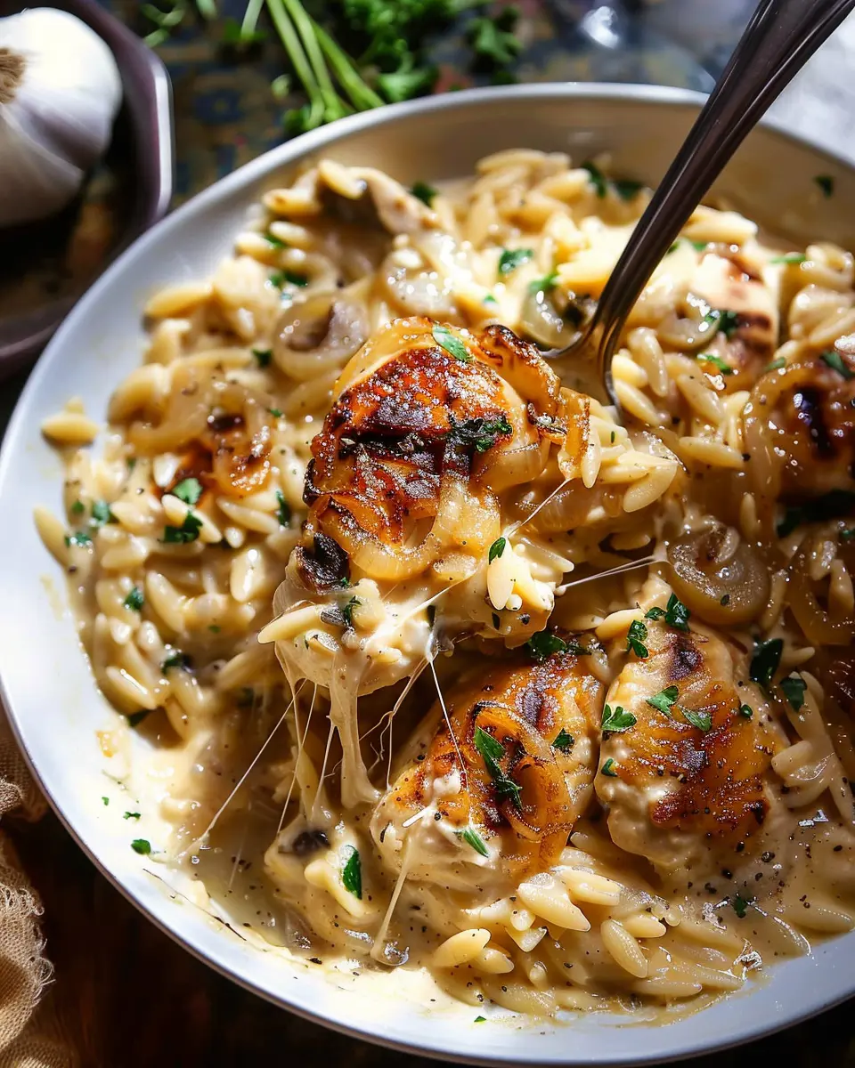 A comforting crockpot dish combining French onion flavors with tender chicken and orzo.