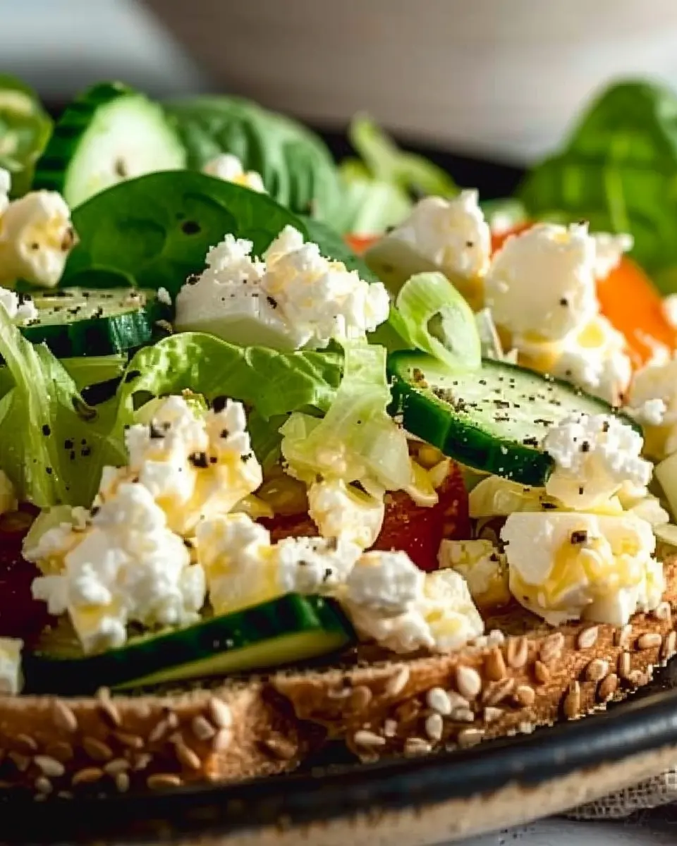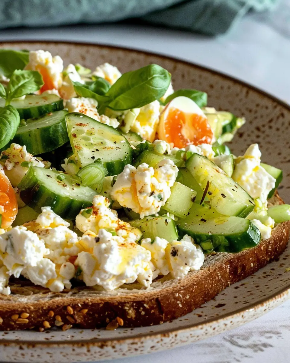 2. Spread the Love: Generously spoon your delicious egg salad with cottage cheese onto your toasted bread. Don’t be shy; a good layer makes all the difference!