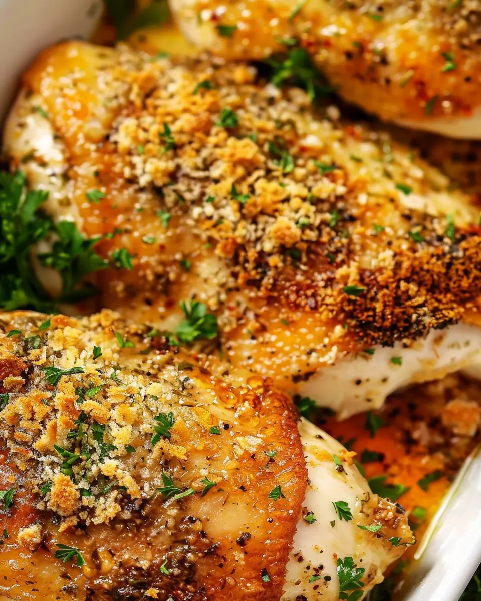 - Place the coated chicken breasts in a baking dish and drizzle any remaining butter on top.