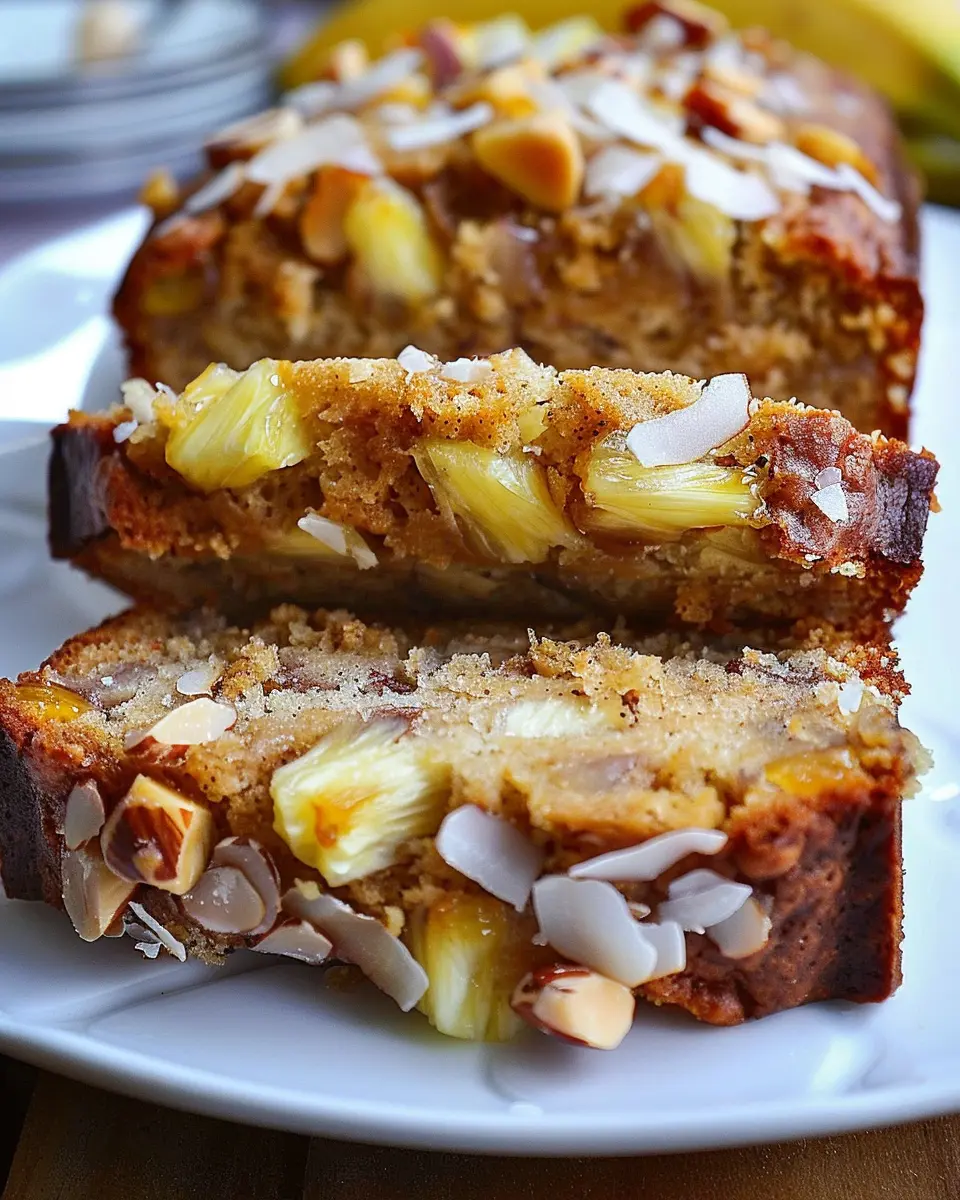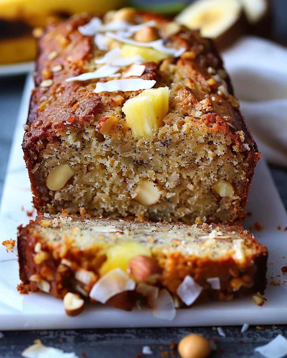 A moist and flavorful Hawaiian banana bread featuring the tropical tastes of pineapple, coconut, and macadamia nuts.