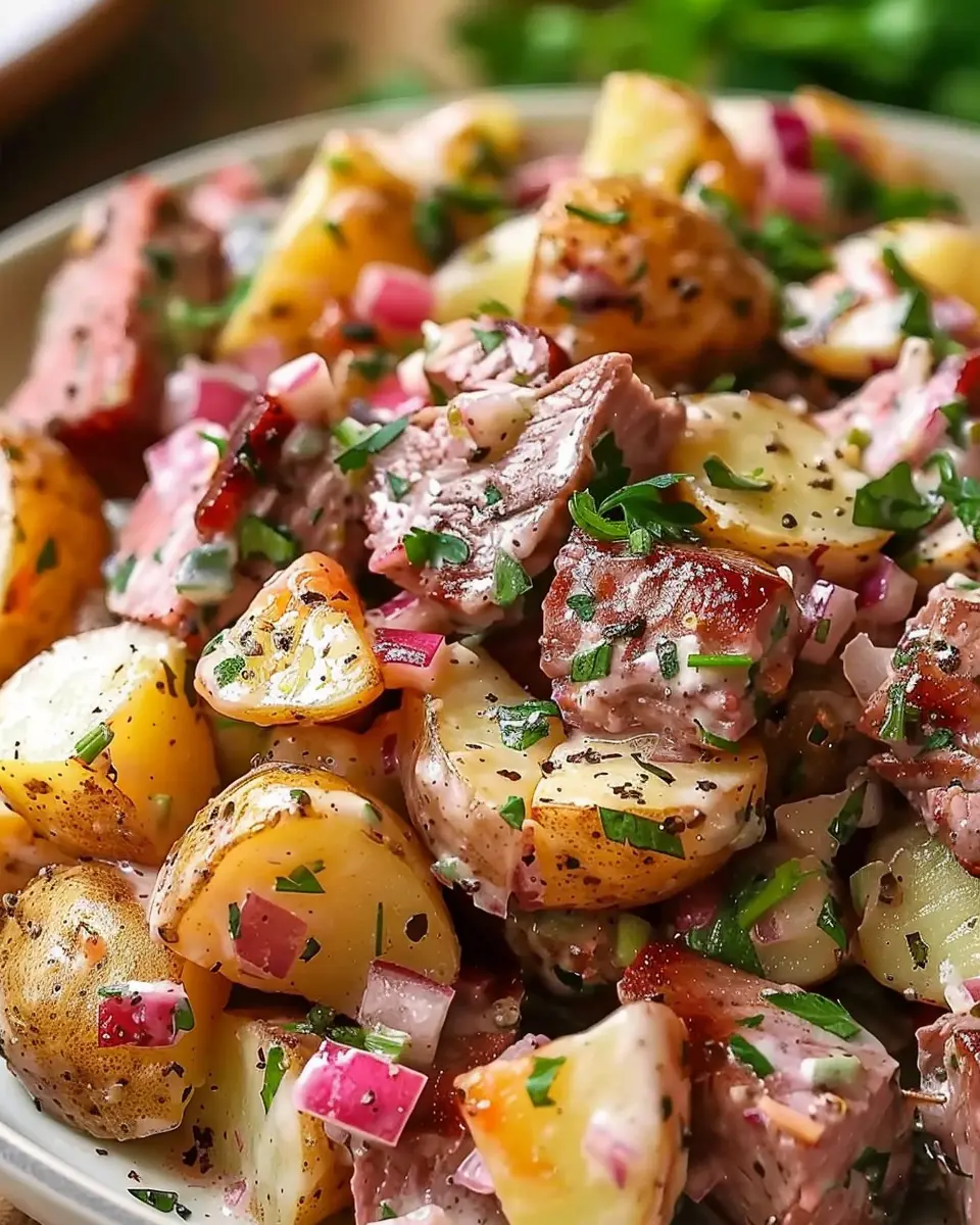 One of the best things about Steakhouse Potato Salad is how versatile it can be. While it’s delicious as is, you can easily elevate it by incorporating different proteins. Imagine topping your creamy potato base with turkey bacon for a smoky crunch. Alternatively, grilled chicken ham adds a subtle sweetness that pairs beautifully with the salad’s flavors. If you’re in the mood for something heartier, shredded beef brings a meaty richness that takes this classic dish to the next level.