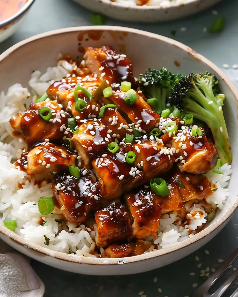 Elevate your Sticky Chicken Rice Bowls with a little flair! Think color and contrast—layer your ingredients in a clear bowl to showcase the vibrant colors of the chicken, vegetables, and rice. Consider garnishing with fresh herbs like cilantro or green onions, and squeeze a lime wedge on top for that extra pop. You can even serve the bowls in pre-portioned mason jars for a fun, on-the-go meal option!