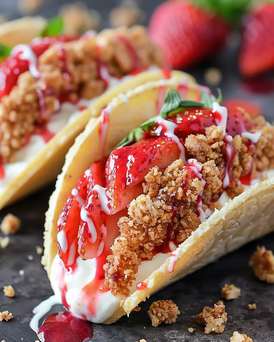 In summary, strawberry crunch cheesecake tacos offer a delightful combination of creamy cheesecake filling and a crunchy, fruity topping, all wrapped in a taco shell that makes for a fun presentation. Not only are they easy to prepare, but they also add a vibrant touch to any dessert table.