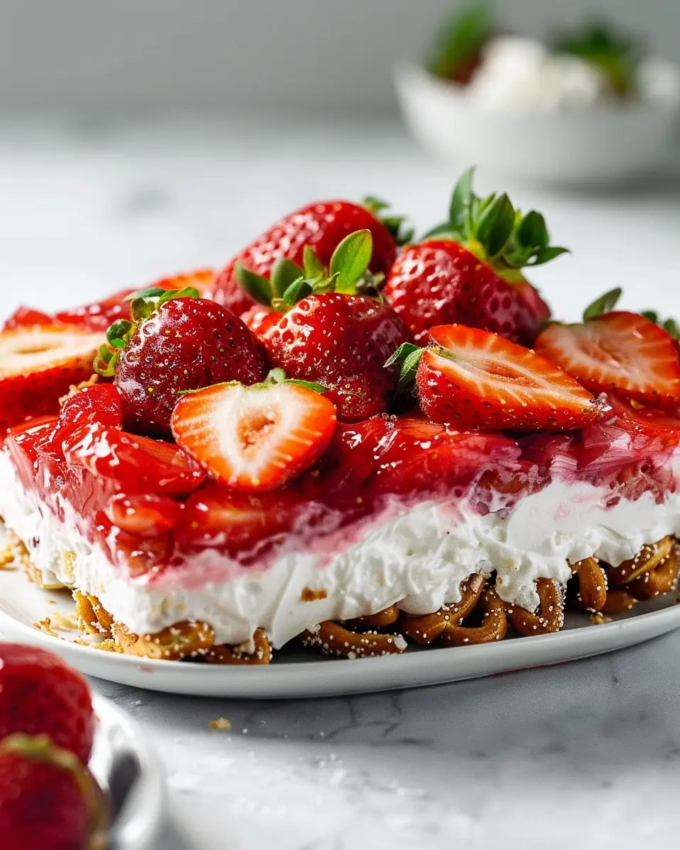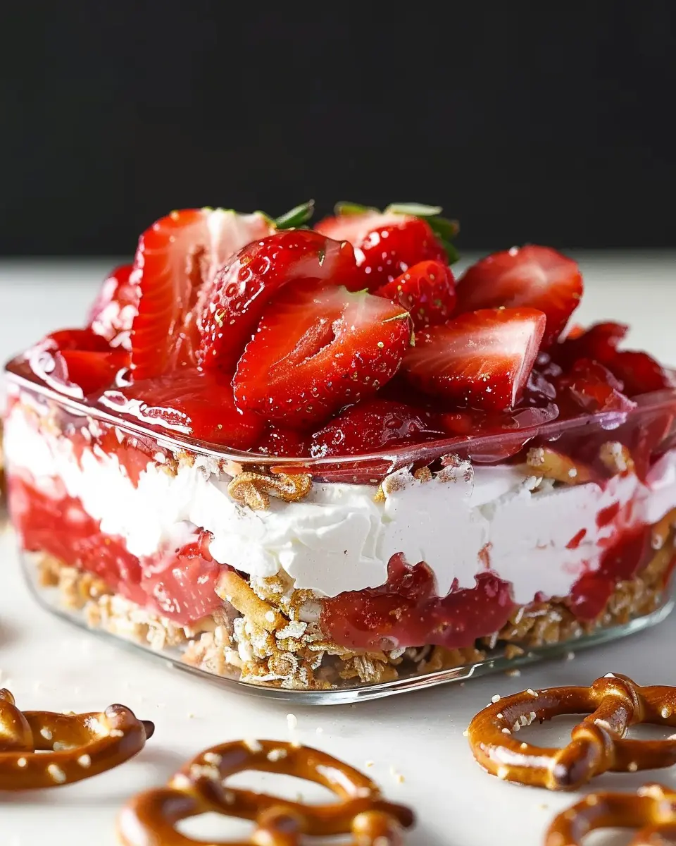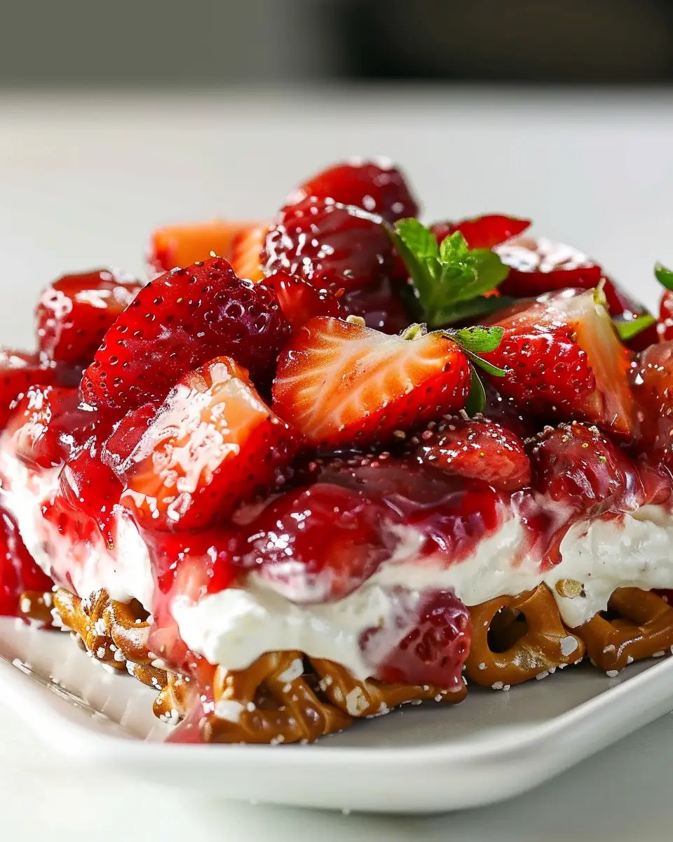 A deliciously refreshing dessert that combines sweet strawberries, creamy filling, and a crunchy pretzel crust perfect for summer gatherings.