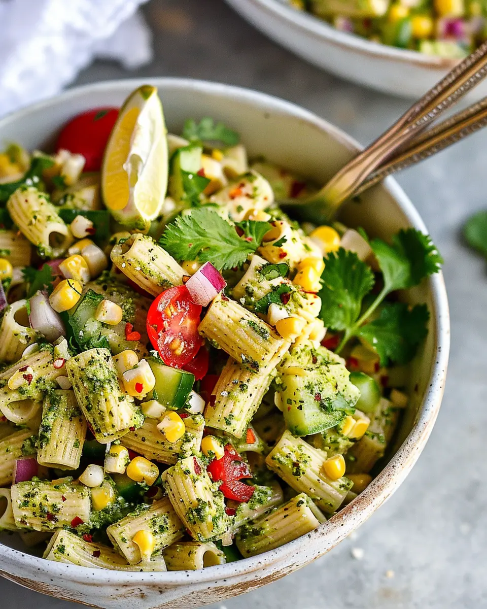 A vibrant and refreshing street corn pasta salad with a flavorful cilantro pesto, perfect for summer gatherings.