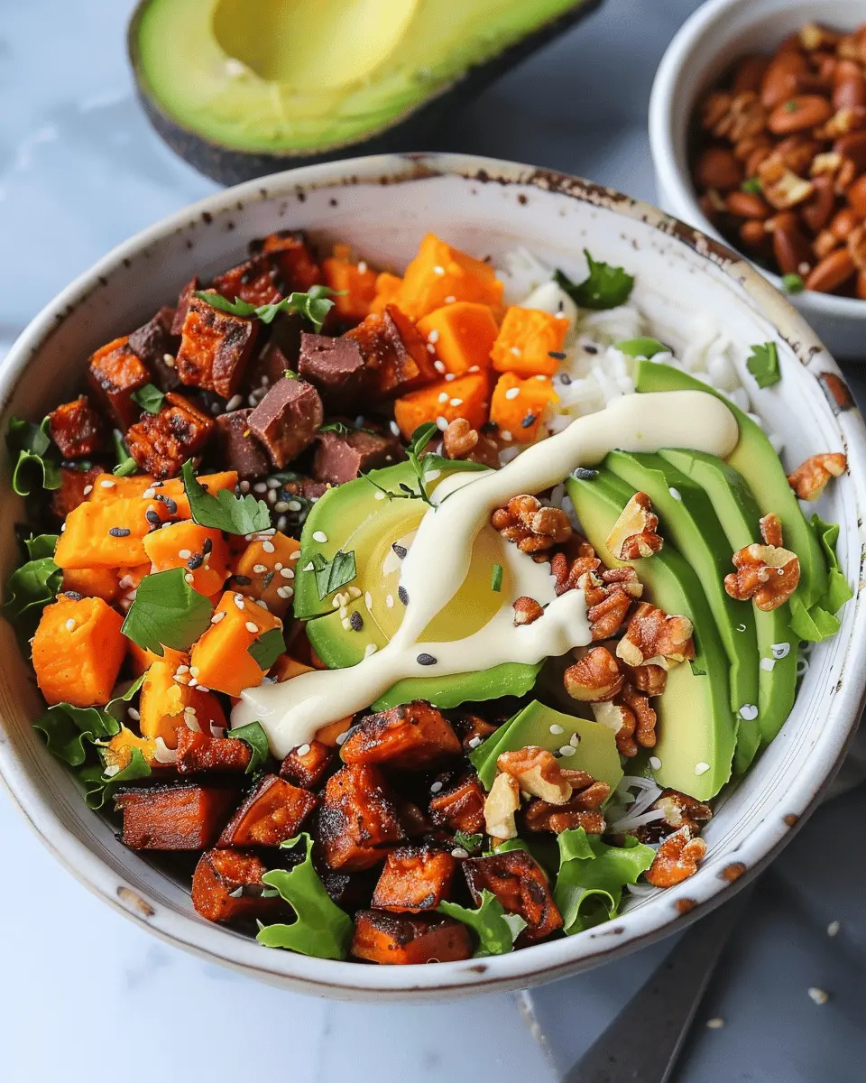 - Assemble the bowl by placing roasted sweet potatoes in a bowl, topping with avocado, Greek yogurt, honey, and chopped nuts.