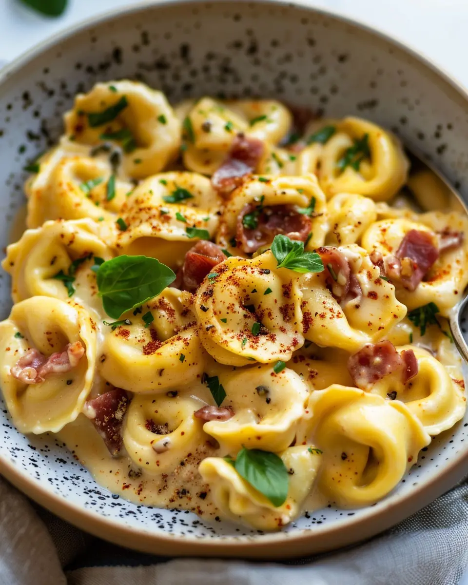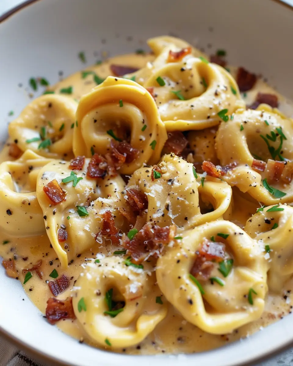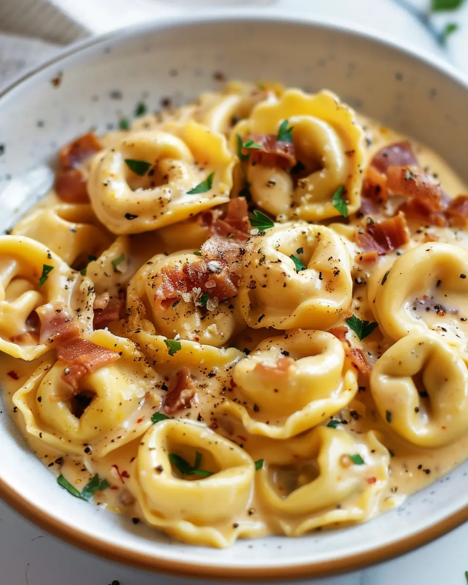 PrintTortellini Carbonara: Easy Turkey Bacon and Chicken Ham Delight