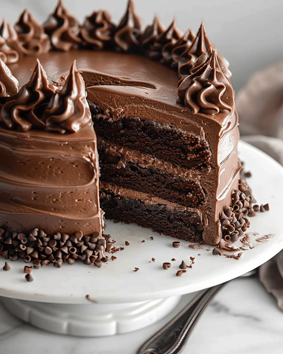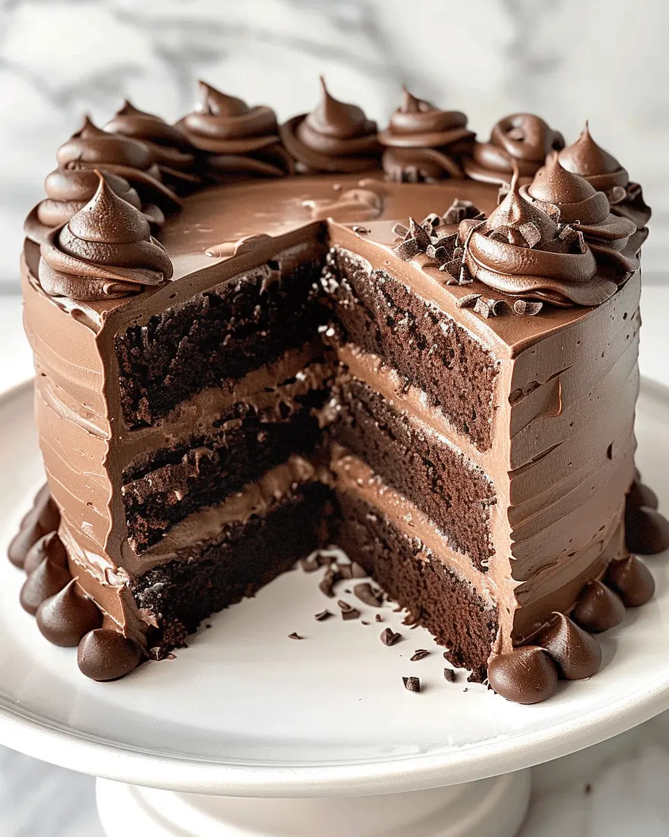 A rich and decadent triple chocolate cake layered with luxurious chocolate buttercream, perfect for any chocolate lover.