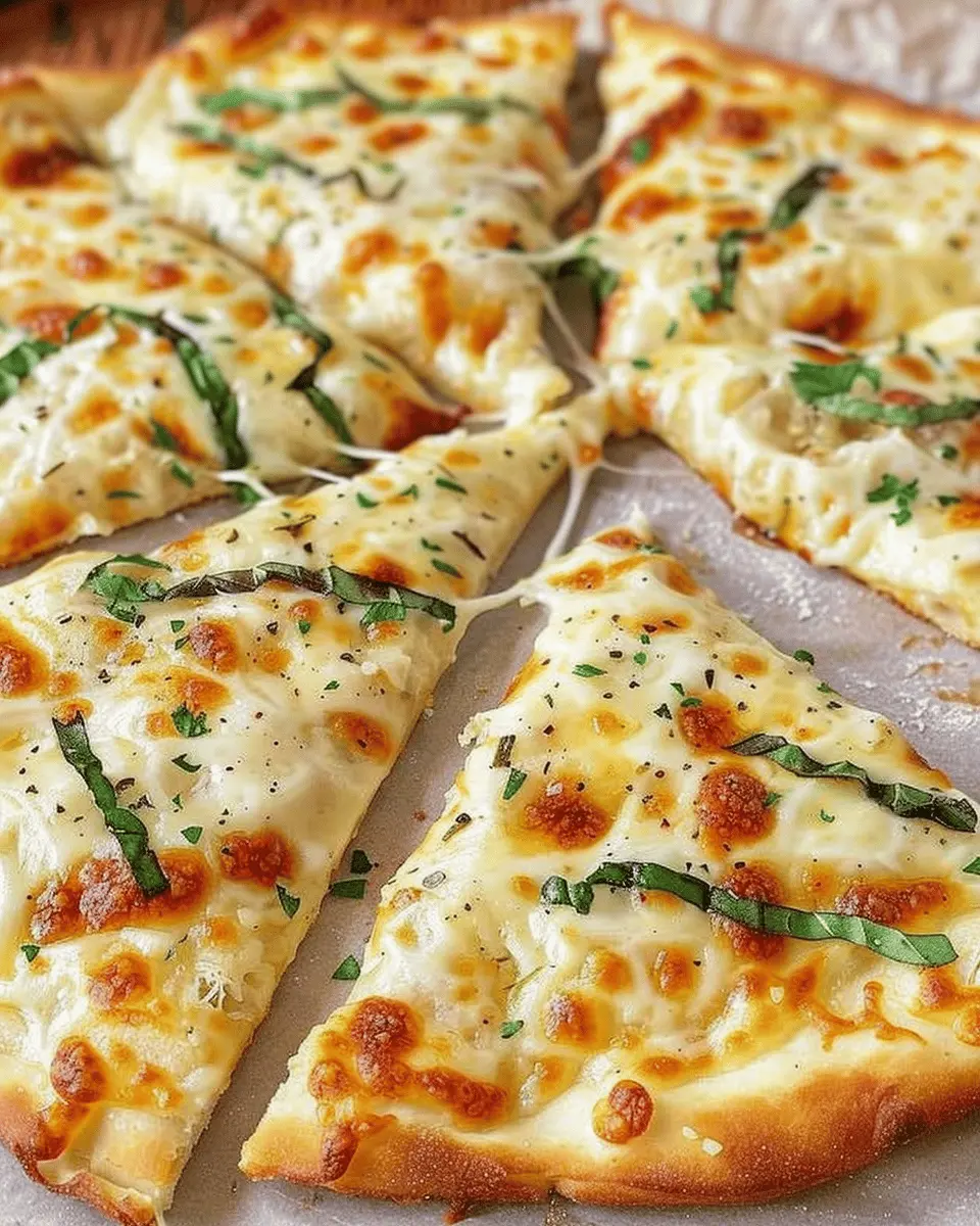 A creamy and flavorful white pizza topped with a rich garlic pizza sauce.